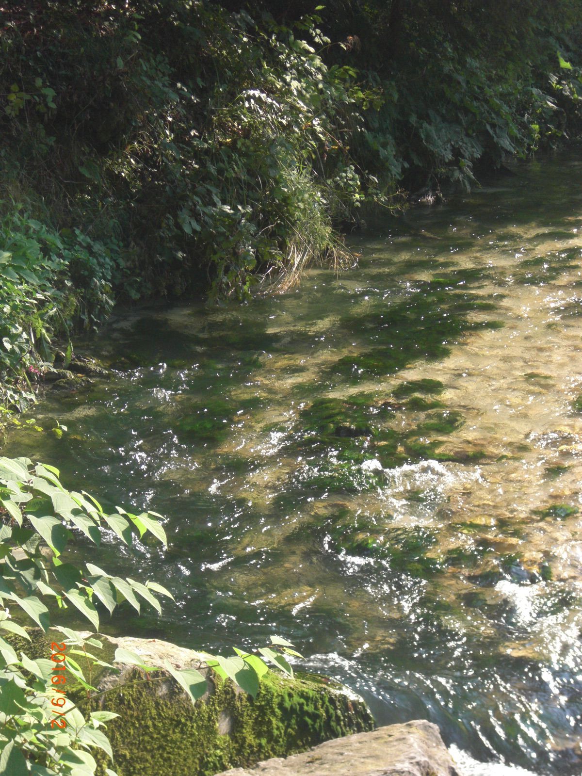 Zu beobachten ist eine Landschaft mit Ufer &Flächen deckenden Bambusähnlichen Knöterich, rosa blühenden Springkraut und goldgelbe Teppiche der Goldrute.